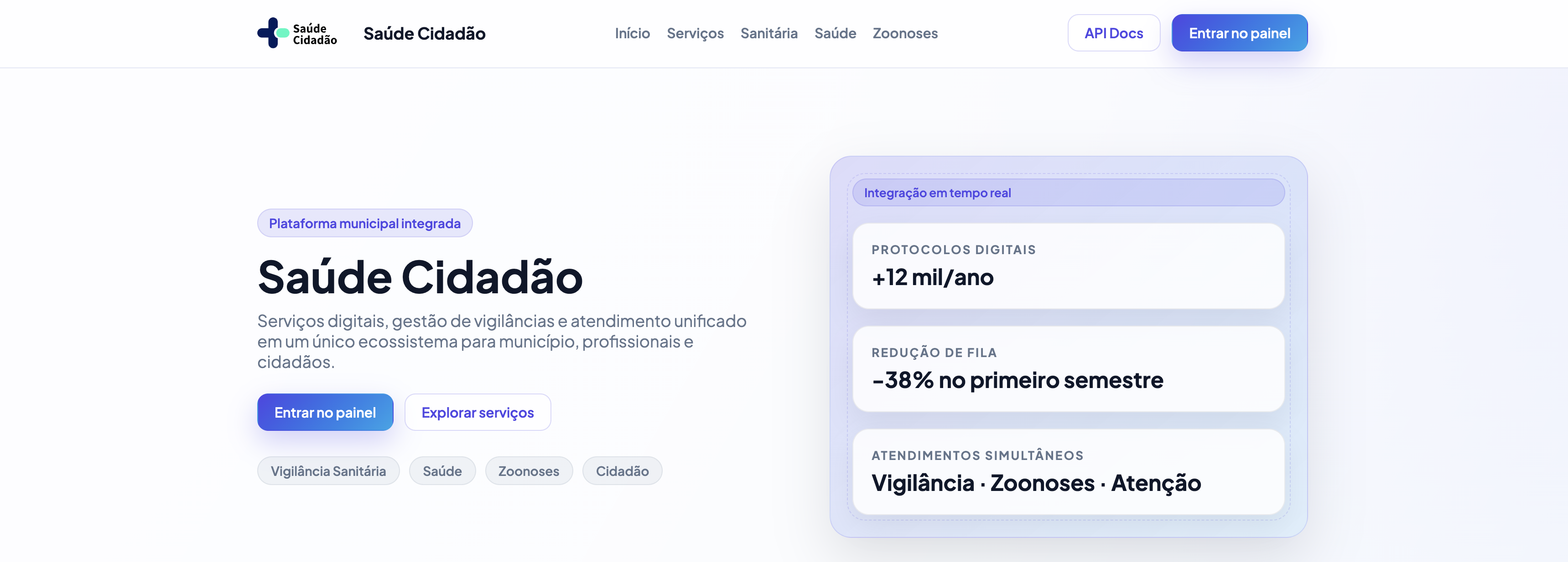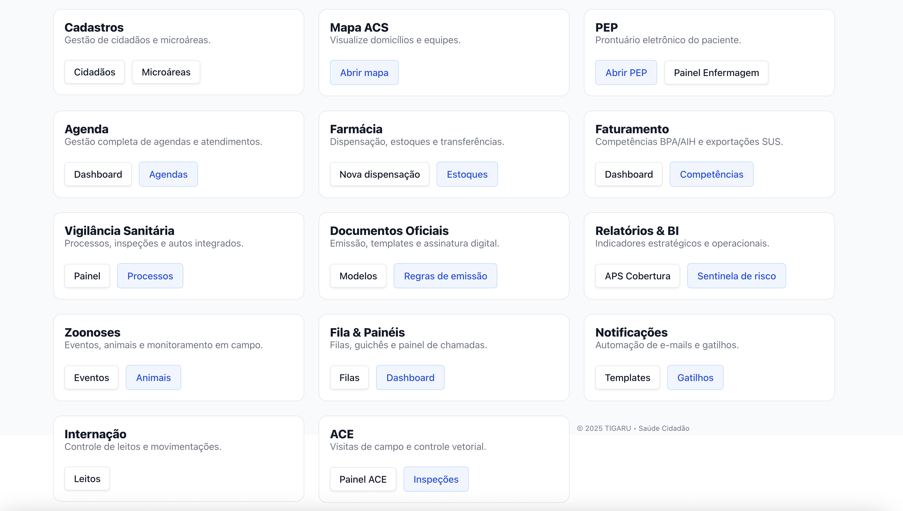 - Fluxos completos de regulação, vigilância, zoonoses e internação.